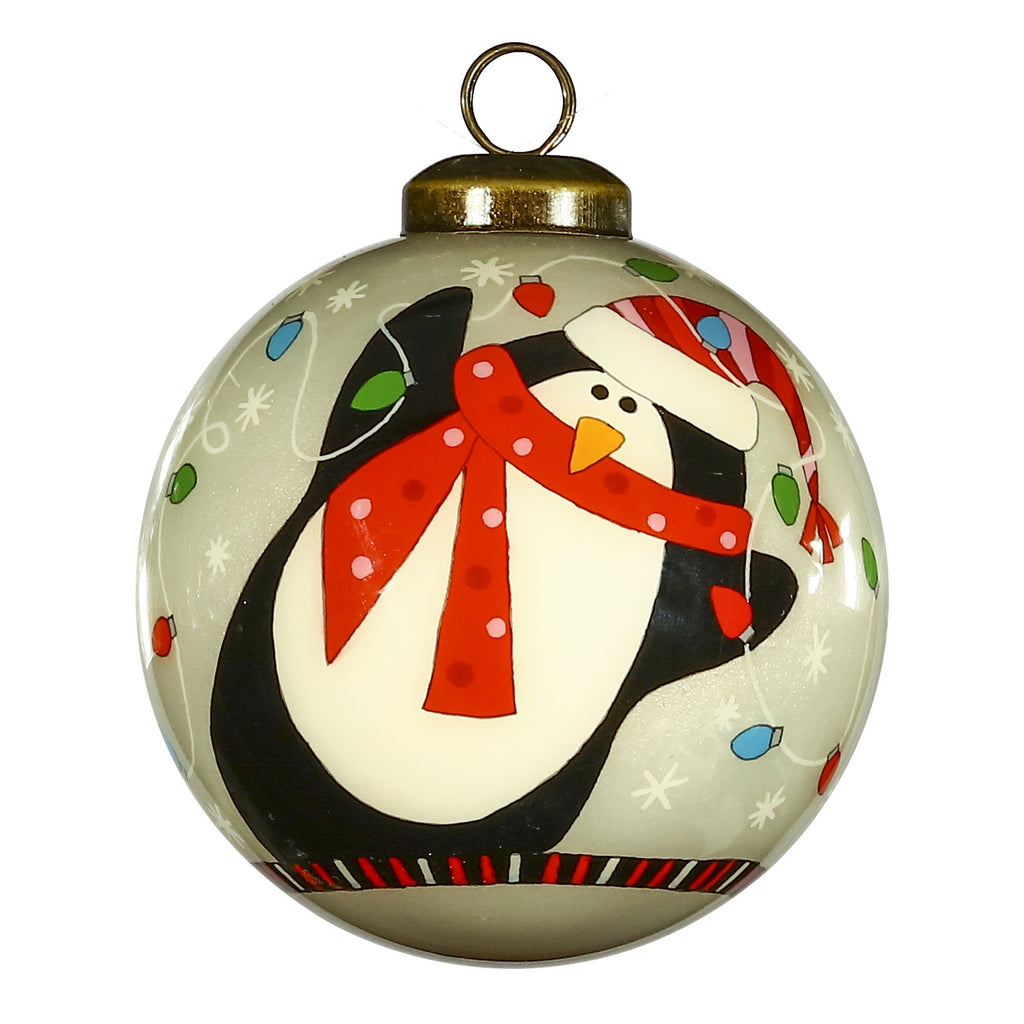Festive Penguin Hand Painted Mouth Blown Glass Ornament