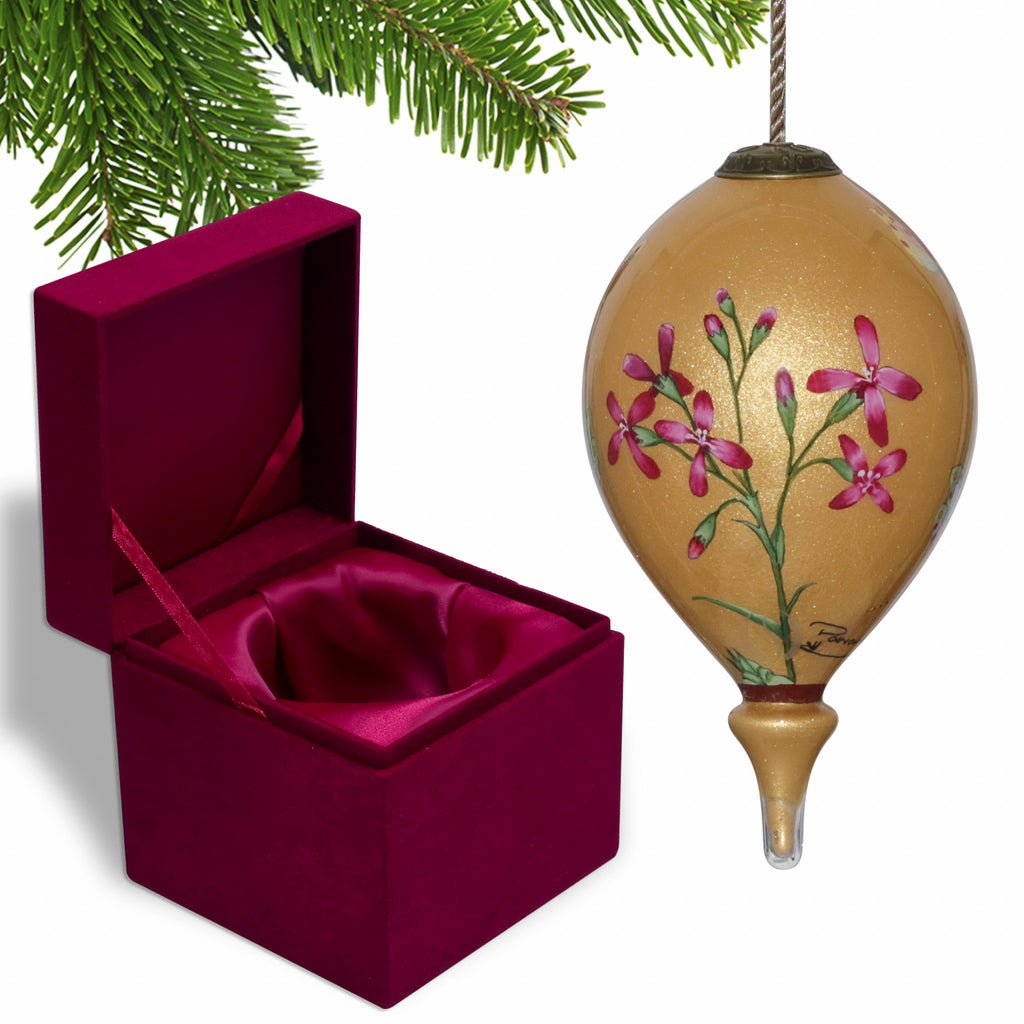 Golden Flowers and Hummingbirds Hand Painted Mouth Blown Glass Ornament