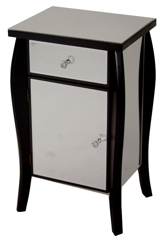 17.3" X 13" X 32.7" Black MDF Wood Mirrored Glass Accent Cabinet with Beveled Mirrored Drawer and Door