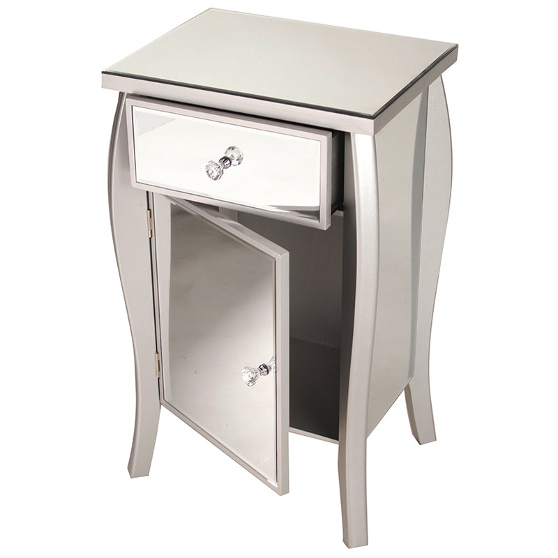 17.3" X 13" X 32.7" Silver MDF Wood Mirrored Glass Accent Cabinet with Mirrored Drawer and Door