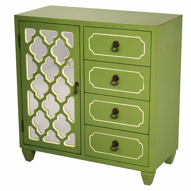 29.5" X 14" X 30.75" Green MDF Wood Mirrored Glass Cabinet with a Door Drawers and Arabesque Inserts
