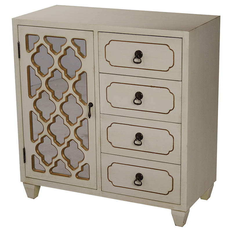 29.5" X 14" X 30.75" Antique White with Gold MDF Wood Mirrored Glass Cabinet with a Gold Door and Drawers