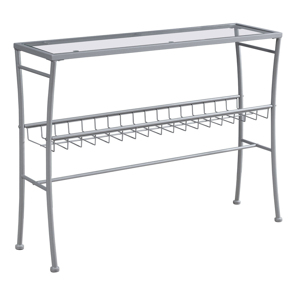 12" x 42" x 32" Silver Metal and Clear Tempered Glass Accent Table