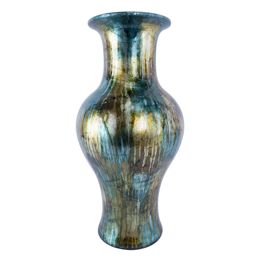 9.5" X 9.5" X 18" Turquoise Copper and Bronze Ceramic Foiled and Lacquered Ceramic Vase