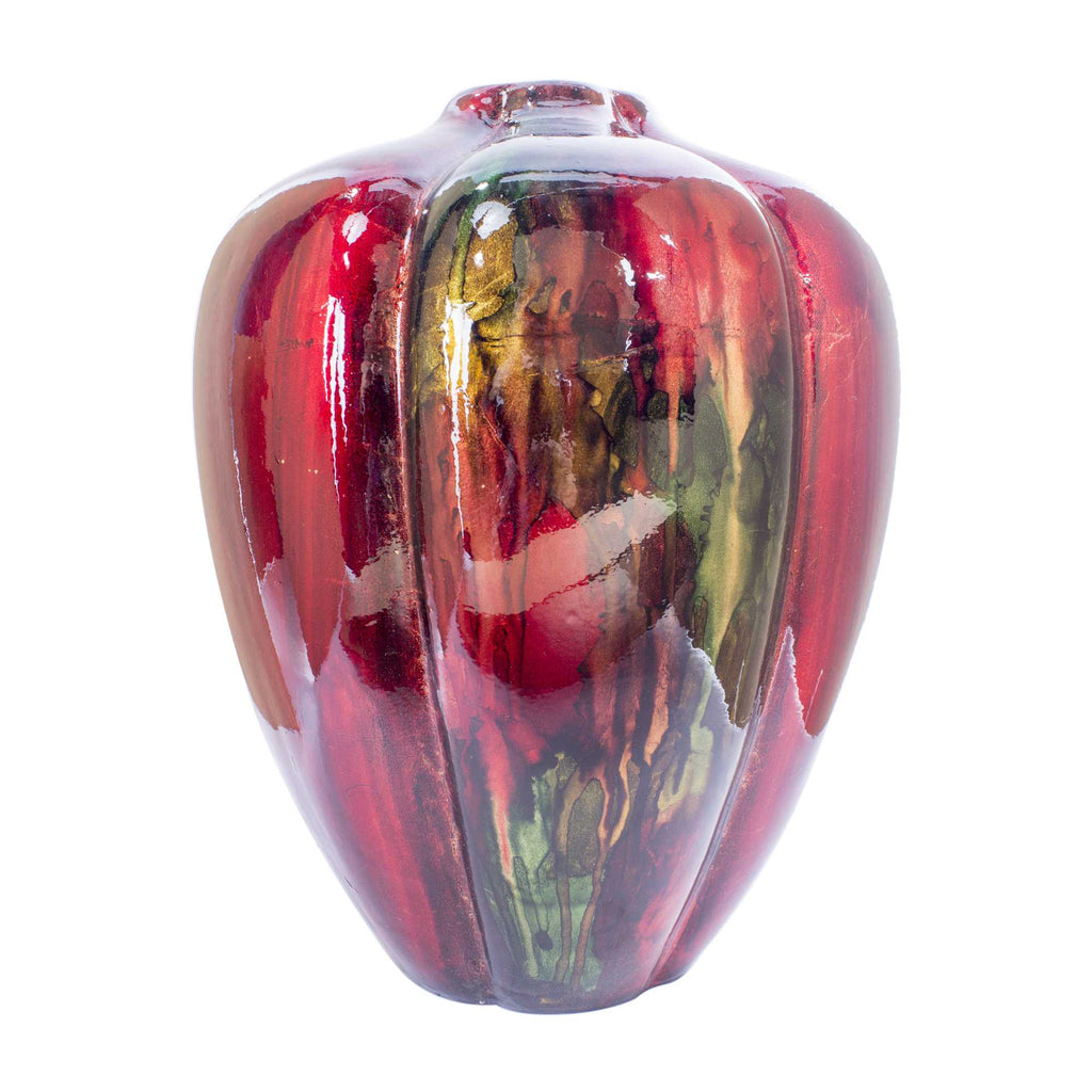 10" X 10" X 18" Red Green Bronze Ceramic Foiled and Lacquered Ridged Gourd Vase